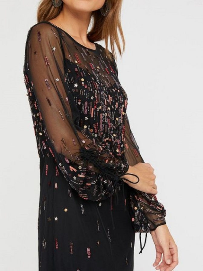 В первую очередь речь пойдет о сетке, которая однозначно украсит ваше платье и сделает его нарядным. Это может быть вставка в зоне декольте, на талии под линией груди, на рукавах и пр. Вторым вариантом, который сделает мрачный черный цвет изысканным и элегантным, является гипюр. Эффект аналогичен сетке. Можете сделать пышные рукава, оборки, платье в несколько ярусов, где главным является верхний слой, а под него надевается чехол.