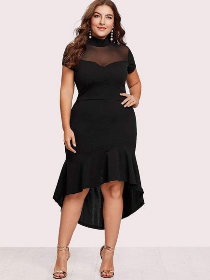 - «Русалка» – узкое черное платье расходится от середины бедра или линии колен. Не корректирует фигуру, потому подходит для невест с идеальным сложением и узкой талией. Силуэт подчеркивает декольте, бедра.