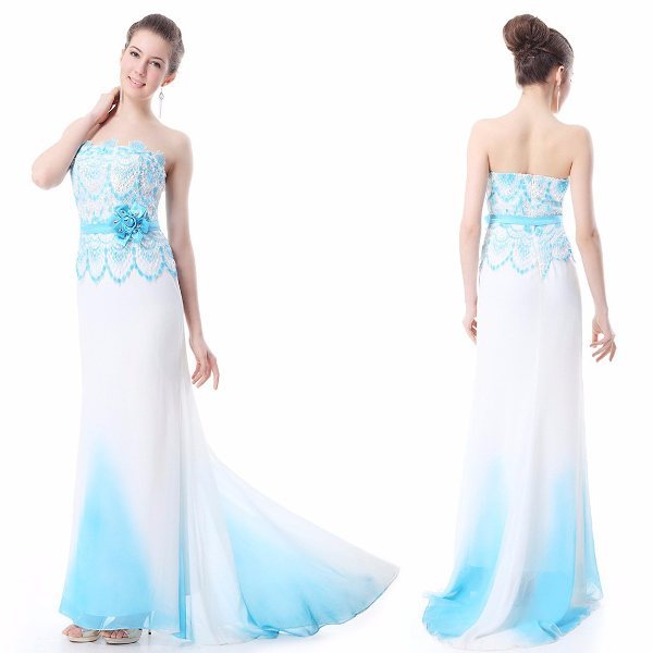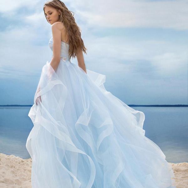 Очень эффектно будет смотреться голубое платье со шлейфом. Современные дизайнеры предлагают очень интересные решения ассиметричных фасонов. При этом голубой цвет гармонично сочетается с белым. Еще одной особенностью является приятное и гармоничное сочетание этого цвета в разных фактурах.