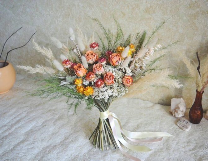 Если он был заказан у хорошего флориста, который обработал цветы особым способом, они надолго сохранят свою свежесть. Можно освободить букет от внешнего декора, подрезать цветы и поставить в воду. Но рано или поздно они утратят свежесть. Можно ли хранить букет невесты дома в практически неизменном виде? Можно, если вовремя позаботиться дальнейшим сохранением букета.