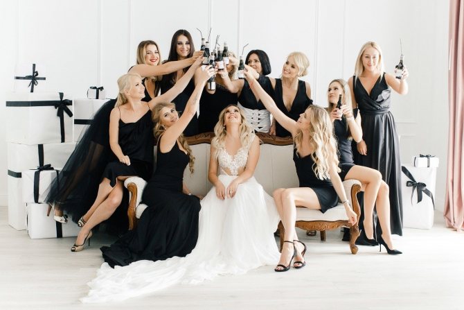 «Белый — только для невесты», а «черный — цвет траура» — времена предрассудков по поводу этих цветов на свадьбе позади, и это здорово! Больше того, многие невесты сами выбирают для своих подружек именно эти цвета, посмотри, как стильно это смотрится! Но все же лучше заранее обсудить выбор этих цветов с невестой — возможно, контрастные оттенки не подойдут к нежной цветовой палитре свадьбы.