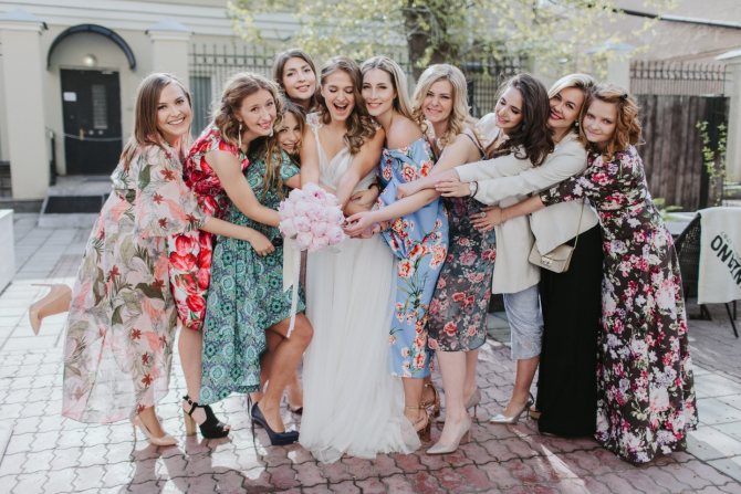 Среди актуальных принтов можно выделить цветочные и анималистичные мотивы, tie dye, полоску и абстракцию. Здесь выбор за тобой, поэтому обсуди варианты с невестой и другими подружками. Может быть, вы сделаете классное сочетание платьев с разными принтами, которые будут эффектно смотреться в единой композиции.