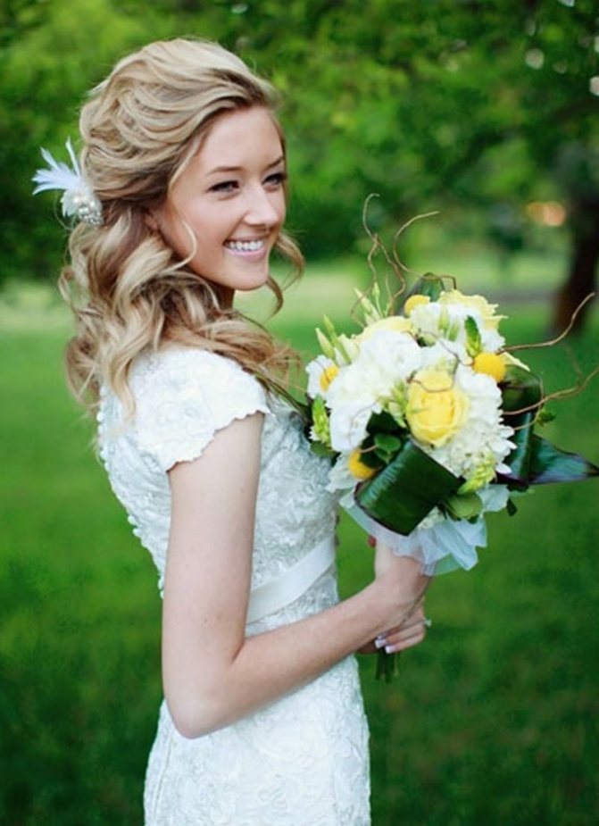 Для того, чтобы невеста была прекрасная на торжестве, ей нужно обратится к стилисту. Он поможет в выборе стильной прически. Свой выбор нужно сделать в зависимости от длины и структуры волос. Если у невесты короткие волосы- можно сделать начес или накрутить, если средняя длина, можно добавить локоны, украсить все цветами или диадемой.