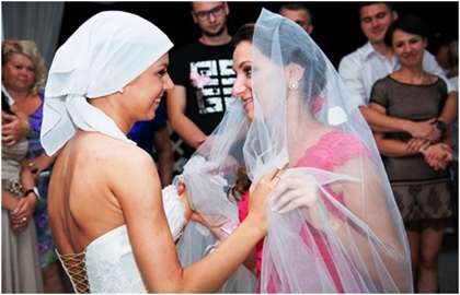 Как можно еще поставить точку? Обратиться к традициям. Очень душевный обряд – снимание фаты невесте ее свекровью, покрывание головы платком, с последующим нежным танцем. Невеста танцует в кругу подруг и по очереди примеряет каждой фату.