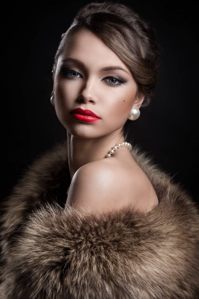 Макияж – копия кино-грима: бледная кожа (светлая пудра), выделяющиеся скулы (розовые и бардовые оттенки румян), тонкие, прорисованные черным карандашом брови, длинные ресницы (как накладные), черная подводка для глаз, ярко очерченные губки (красная или темная помада), насыщенный макияж глаз (темные матовые оттенки теней). Яркие лаки для ногтей.