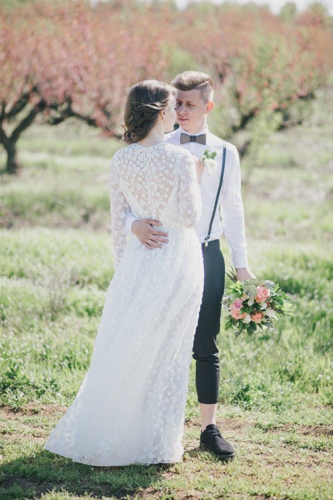 Хотите дополнительно подчеркнуть хрупкость и нежность невесты? У невесты шикарное платье, и спина роскошна? Жених стоит лицом к камере, а невеста повернулась к нему, обнажая хрупкую спину. Если жених и невеста одного роста – жениху лучше стать на небольшую возвышенность.