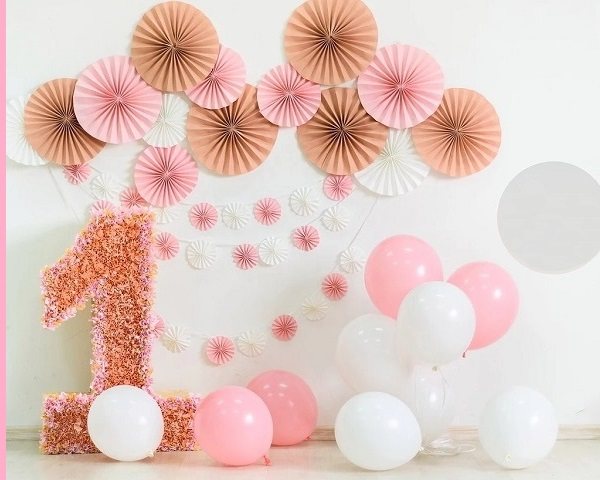 «Единичка» — центральный элемент фотозоны на первый день рождения. Проще всего заказать шар заданной формы. Основу украшают конфетами, елочными игрушками, бумажными помпонами.