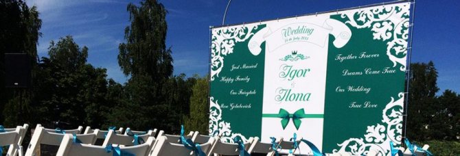 Не используйте в качестве основы слишком тяжелую ткань, если не найдете специальную баннерную, чтобы она не провисала. Если такое произойдет на вашей свадьбе, то вся праздничная атмосфера будет нарушена, а настроение молодых испортится.