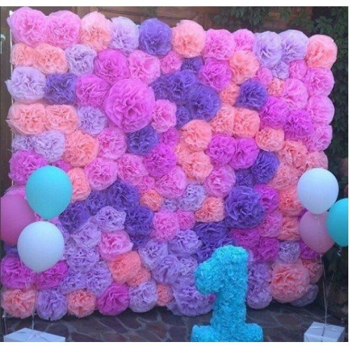 Самым популярным и недорогим способом украсить фон является использование салфеток. Потребуется немалое количество этого материала, но эффект пышности будет стоить потраченных усилий. Салфетки собираются в гармошку и посередине перетягиваются ниткой, создавая пушистый помпон. Несколько таких разноцветных шаров крепятся на картон. Так их лучше транспортировать. Картон желательно выбирать плотный, чтоб не гнулся.