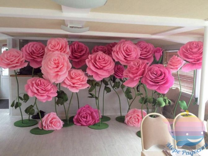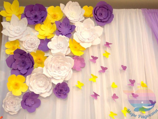 - Получившиеся бумажные цветы надежно прикрепите к баннеру, стойке, стене.