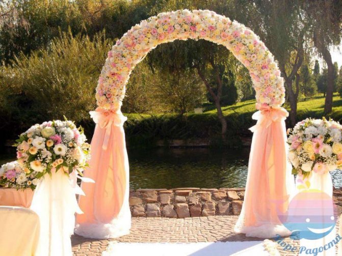 Круг. Подходит для нежного шебби-шика. Каркас декорируют обычно живыми цветами, например, розами, пионами. Бутоны должны быть нежных цветов. Текстиль для драпировки подбирают пастельных тонов: бледные розовые и желтые тона, кремовые, бежевые.