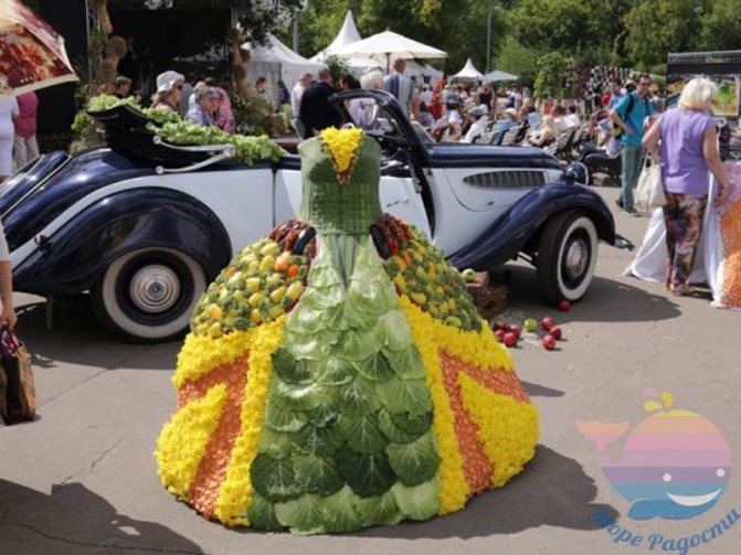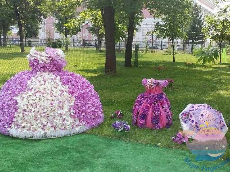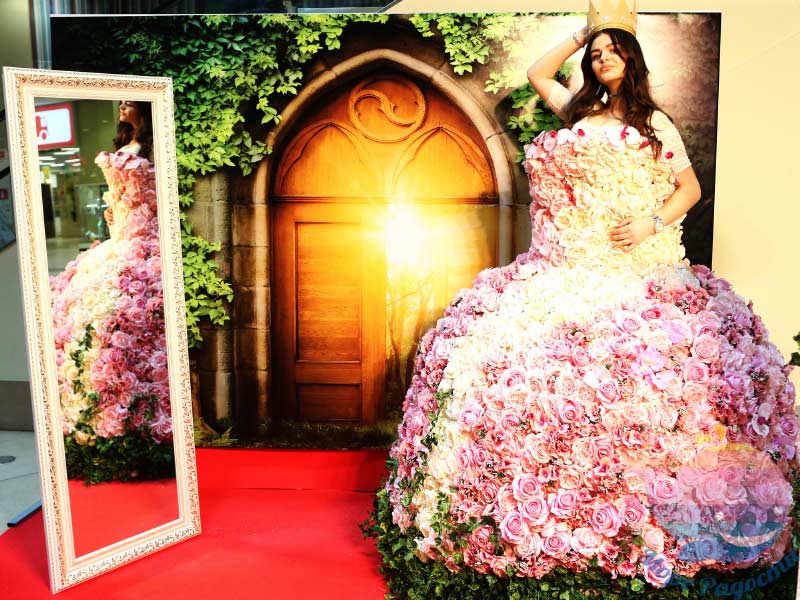 Каждая девушка может почувствовать себя настоящей принцессой, сфотографировавшись с интересной декорацией – цветочным платьем. Такие интересные композиции можно встретить в крупных торговых центрах. На цветочных выставках флористы создают невероятную красоту из живых цветов.