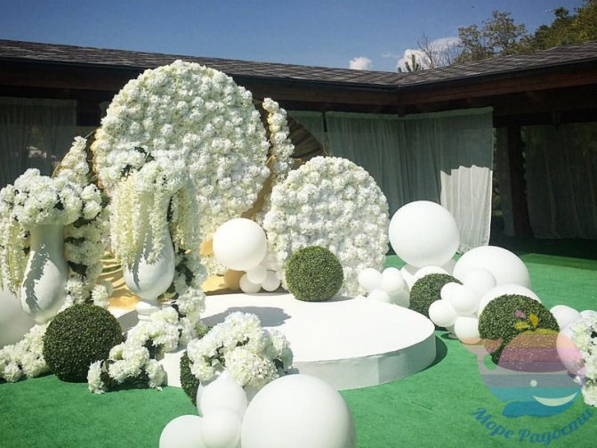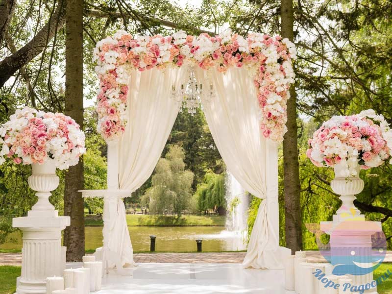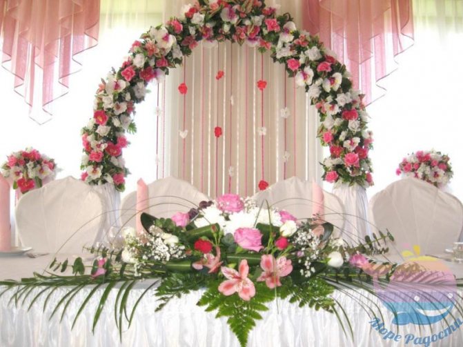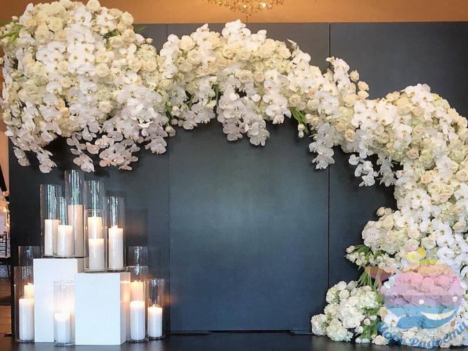 Чаще всего такую конструкцию применяют на свадьбе, ведь цветы наполняют торжество легкостью, воздушностью, сказочным волшебством. Но заранее надо обговорить с гостями такой элемент декора. Ведь на цветы у некоторых может быть аллергия.