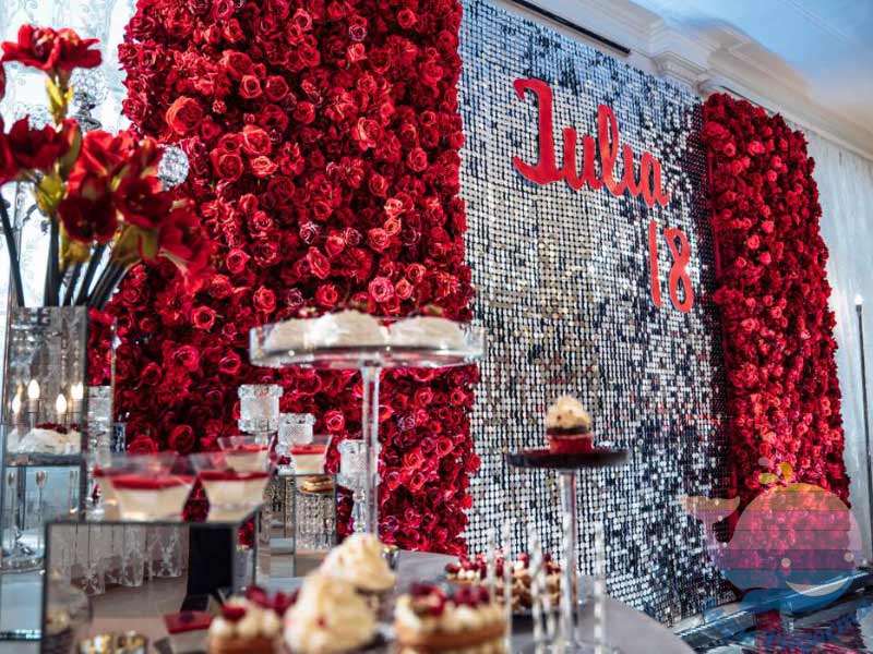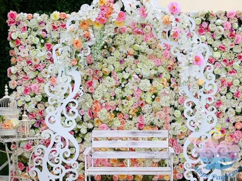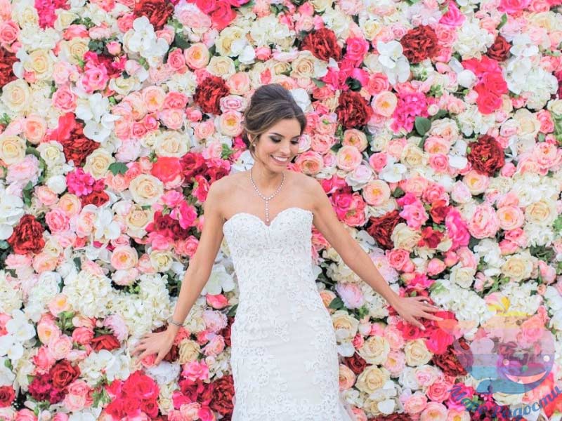 Цветочная стена сама по себе придает празднику особый вид, добавляет уникальности и необыкновенности. Но главное условие – большой размер и большая высота, только так цветочная фотостена станет действительно шикарным дополнением.