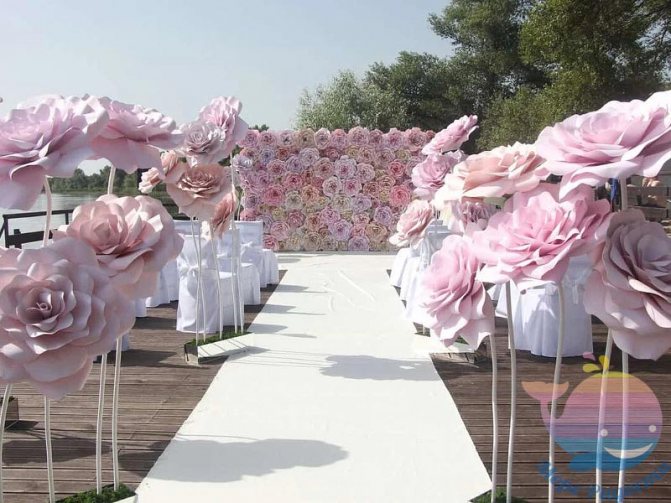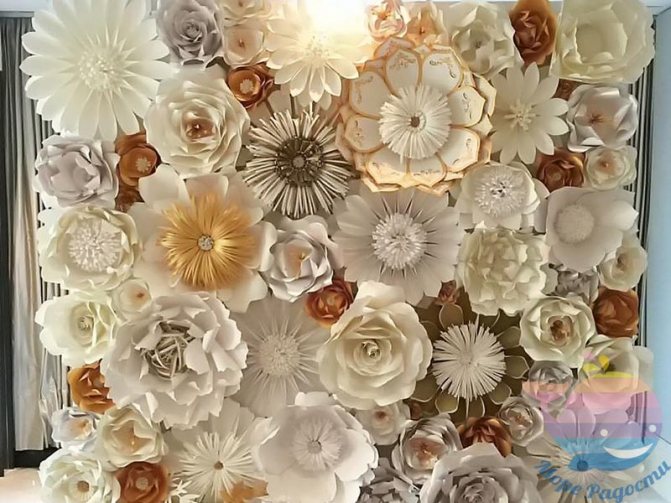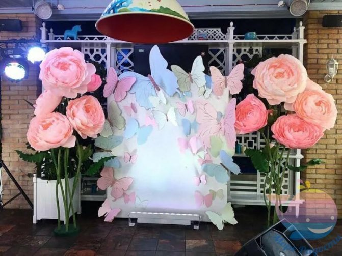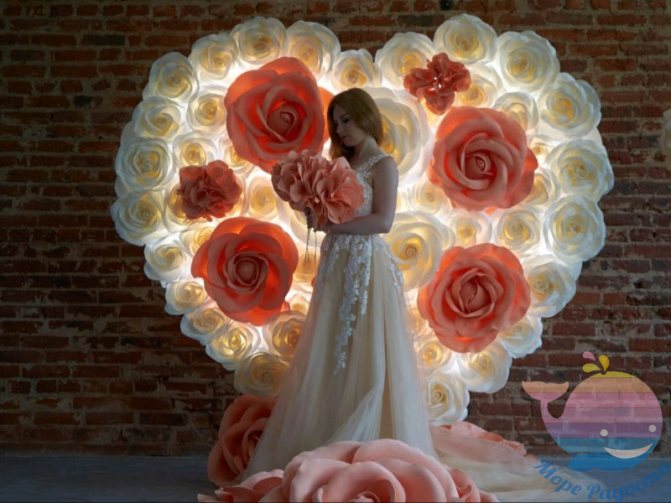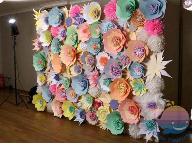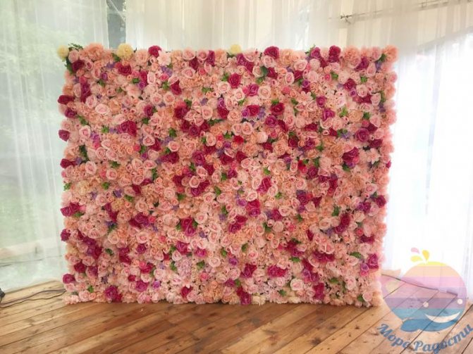 Основой может стать плотный картон, лист ДВП, гипсокартон. Строительным степлером и клеем цветы прикрепляют в нужном порядке. Так и получится задний фон, аналогичным образом можно создать боковые зоны, соорудив фотозону-ширму. Кстати, можно обойтись и без большой основы. Взяв проволоку, декоративные горшки, можно соорудить бутоны-гиганты. Их расставляют на полу в абстрактном порядке. Более простой вариант – развесить на потолке свисающие цветочные гирлянды. Привлекательно смотрится градиентная палитра.