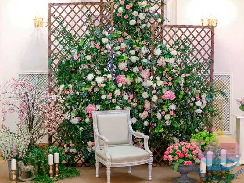 Цветочная ширма – удобный вариант оформления, так как его легко собрать и разобрать. Ее без проблем можно доставить, например, в ресторан, где планируется какое-нибудь торжество. И сама ширма может иметь цветочный орнамент. Но и обычную ширму при желании красиво можно оформить различными цветами – хоть живыми, хоть искусственными.