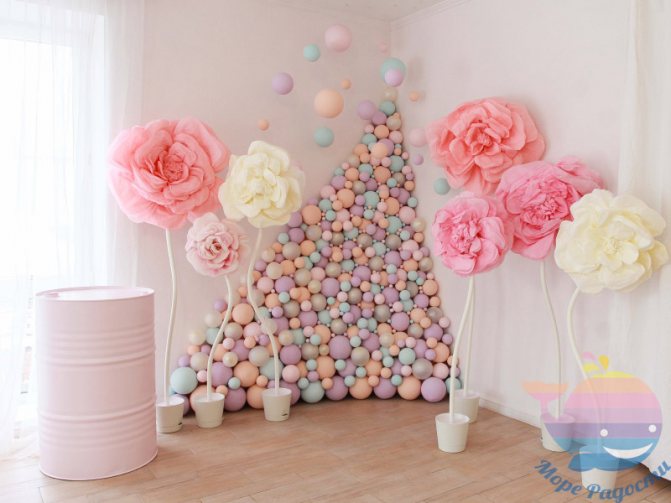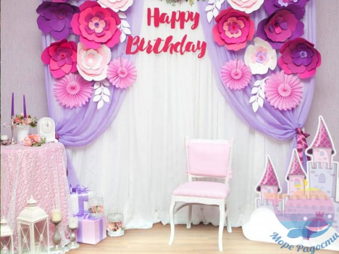 Для детского дня рождения лучше использовать бумажные цветы. Их можно дополнить воздушными шариками и формами из картона: замки, кареты, персонажи мультфильмов. Можно оформить цветами объемную цифру (возраст именинника) или же заказать уже готовые изделия.