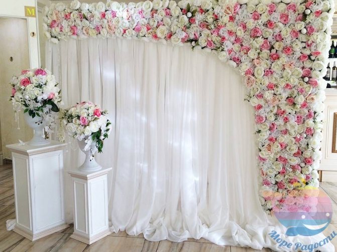 Баннер с цветами. На конструкцию из балок/труб натягивают полотно с рисунком и цветочным фоном. Далее остается украсить стенд искусственными или живыми цветами. Можно закрепить цветы по всей площади баннера. В оформлении можно использовать цветы вместе со струящимися тканями. Они должны легко драпироваться. Такая фотозона смотрится воздушнее, нежнее.