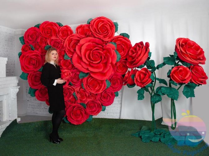 Из изолона получаются красивые огромные цветы, которые долгое время держат свою форму. Лепестки получаются приятными на ощупь, очень мягкими. К преимуществам этого вида декора можно отнести то, что созданная композиция смотрится ярко, свежо даже после праздника. Ее можно оставить для следующего раза.