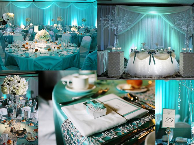 Наиболее популярной «голубой» свадьбой считается церемонии в стиле Тиффани. Для создания особого настроения понадобится сочетание белого и нежно-бирюзового оттенка в оформлении зала, интерьера и мест для гостей. Утонченность, шарм и особое сочетание оттенков просто завораживает! Дух ретро, присутствие бирюзового оттенка Tiffany blue, блеск хрусталя и страз, нежные цветы создадут потрясающую атмосферу.