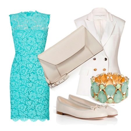 Кружевные или гипюровые бирюзовые платья замечательно сочетаются со светлыми оттенками. Аксессуары белого цвета или оттенка в комбинациии с бирюзовым платьем создадут незабываемый сказочный образ, который не сможет оставить окружающих равнодушными.