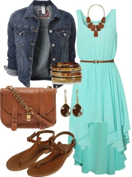 Летящую модель можно носить с балетками или босоножками очень светлых оттенков. Также сюда отлично впишется светлая сумочка на тонком ремешке. Это великолепный вариант для свидания или прогулки по городу. В дополнение к такому наряду можно подобрать белый тонкий пояс, серьги бирюзового цвета (однако они не должны быть слишком объемными и массивными). В вечернее время суток поверх такого наряда смело надевайте джинсовую курточку.