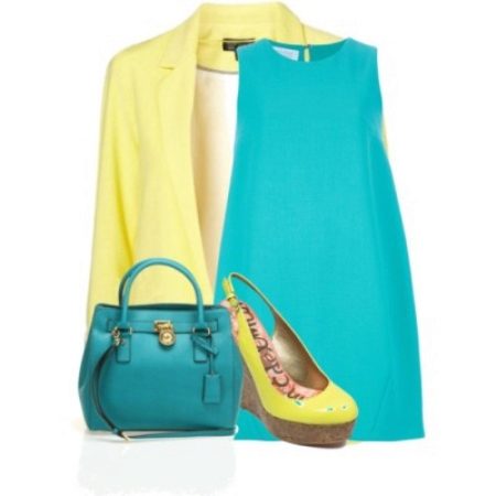 Для рабочих будней или учебы сочетайте бирюзовое платье с бледно-желтым жакетом и лимонными балетками или босоножками. У вас получится очень стильный, яркий и в тоже время практичный образ на каждый день.