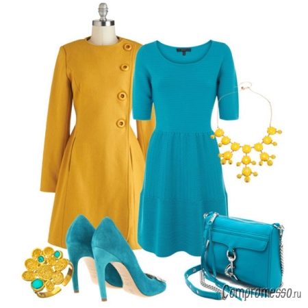 Отлично бирюзовое платье сочетается с одеждой классического черного цвета. Также не стоит упускать из внимания яркие оттенки. Бытует ошибочное мнение, что бирюзовый ни в коем случае нельзя сочетать с насыщенными контрастными цветами. Здесь, главное, лишь не переборщить.