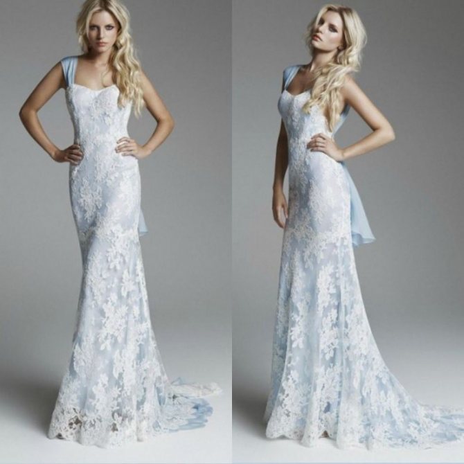Существует традиция надевать на торжество что-нибудь голубое. Если голубой не подходит под стиль церемонии, голубую ленту вшивают в корсет либо используют повязку на ногу этого оттенка. Приметы гласят: голубой дарит искренние и чистые отношения, является символом постоянства, совершенства и верности. Оттенок идеально подойдет тем, кто ценит прямоту в отношениях. Почему же не одеть свадебные платья в голубых тонах? Это очень символично, к тому же смотрится привлекательно и нежно.