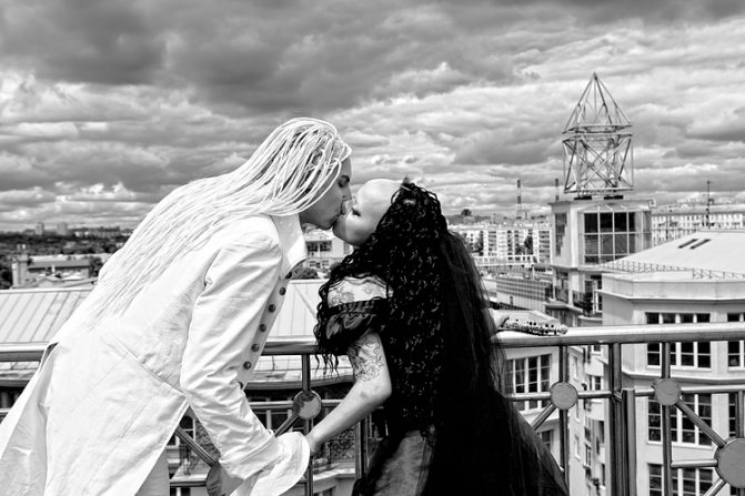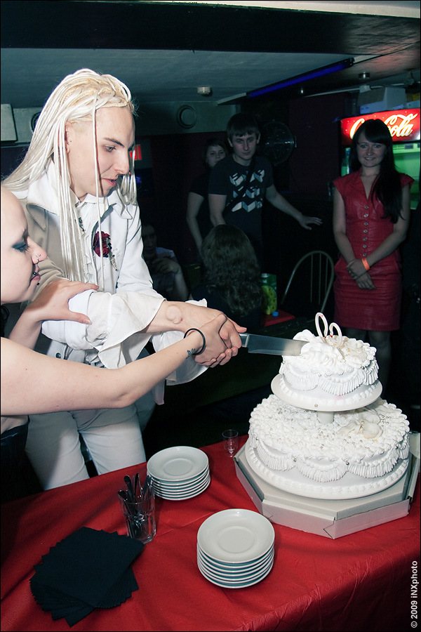 — Концерт с банкетом был в клубе План Б, там за сценой была маленькая комната со столами, куда еле-еле поместились все люди, которые были причастны к нашей свадьбе, гости из Германии, из Украины, из Питера. Вход на концерт был для всех желающих, цена билета была 300р. На сцене выступали наши друзья: Medulla, Штрихкод, Sect, Diana Dark, фрик-шоу Abmormal Clownery Suspension Crew и Matreshka Girls. По клубу расхаживали татуированные девушки в латексе, на сцене рубили металл, диджеили готику, — фрик шоу забивал гвозди друг другу в носы, подвешивало девушек, запускало насекомых в носы и рты желающим… в общем беспредел творился. Крутейший беспредел! 16
