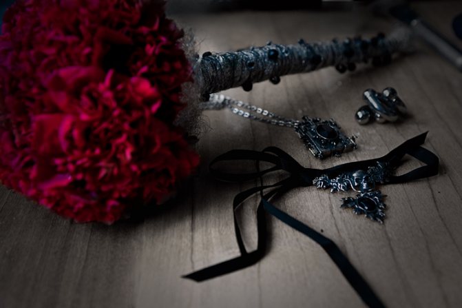 Букет – основной атрибут для невесты. Вот здесь уже фантазия может разгуляться вовсю. Главное чтобы он выглядел мрачно и в тоже время роскошно. Решающим здесь является цвет – черный, синий, темно-красный, алый или любой темный холодный оттенок. Это добавит пикантности. Причем не обязательно цветы должны быть живыми. Из чего могут быть изготовлены цветы в букете: