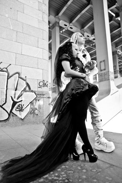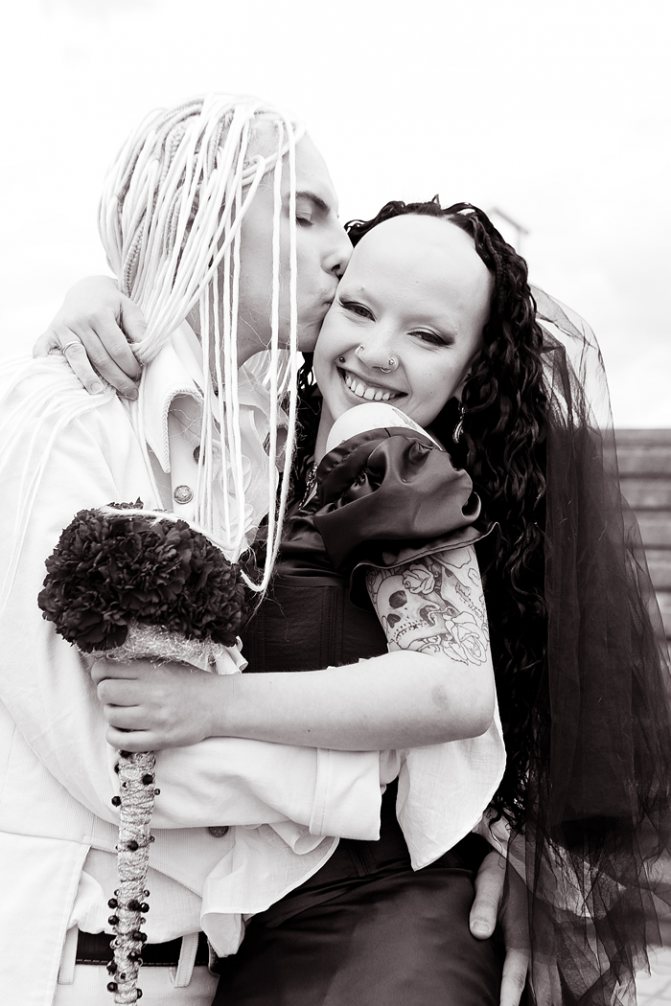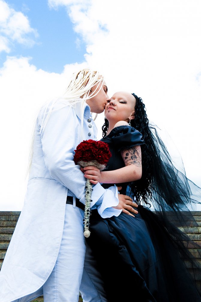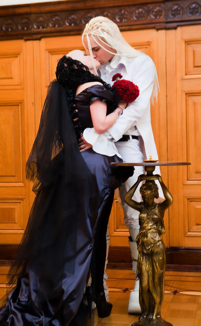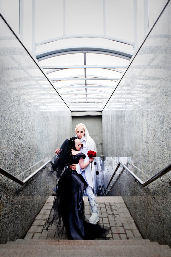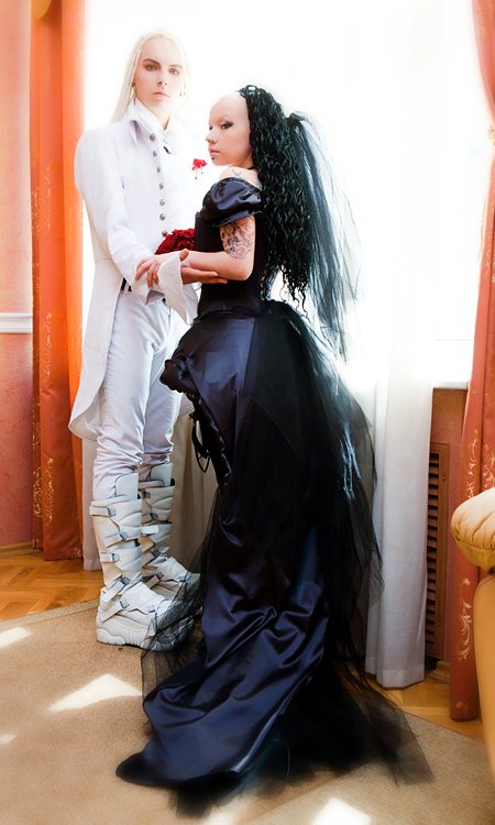 Я всегда мечтала выходить замуж в черном платье. В детстве мне казалось, что это оригинально. Когда я выросла, мои желания обрели стиль, и я выходила замуж по канону моей готической субкультуры. Муж мой был не готом, а металлистом, но ему прикольно было соглашаться на мои придумки. Что из этого вышло — покажу на фото. Я сочувствую тем людям, которые женятся по залету, или празднуют свадьбу «для родителей». Зачем это? Оставляет чувство разочарования на всю жизнь, — я вот хочу еще одну свадьбу в церкви, тоже с черным платьем, но пока только лишь мечты. Ибо венчание это навсегда, и я часто бываю не уверена. Да и предложение руки и сердца я жду «как в кино». Считаю, что так правильно. 10 лет назад мы разорвали шаблон, организовав себе «неформальную» свадьбу, красиво, стильно, интересно. Теперь этим всем уже никого не удивишь, хотя некоторые наши фотографии до сих пор попадают в подборки «дебильных свадеб», наравне со свадьбами бомжей, голых людей и так далее… Почему? только потому что мы фрики ?.. 2