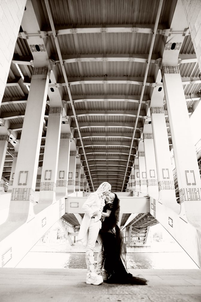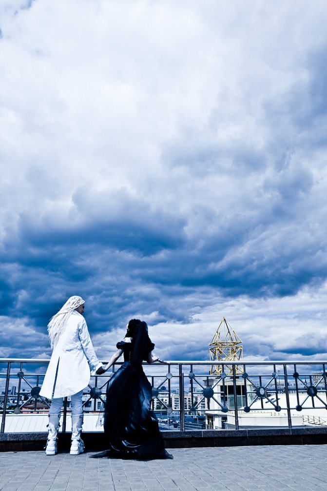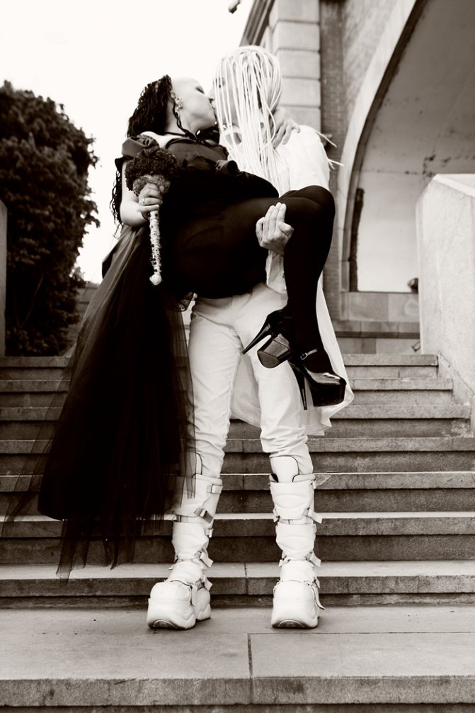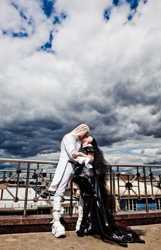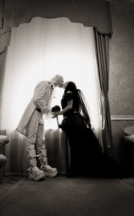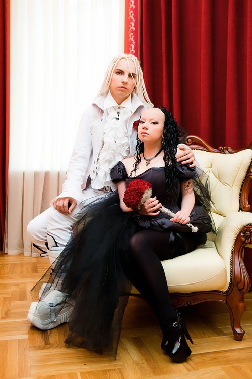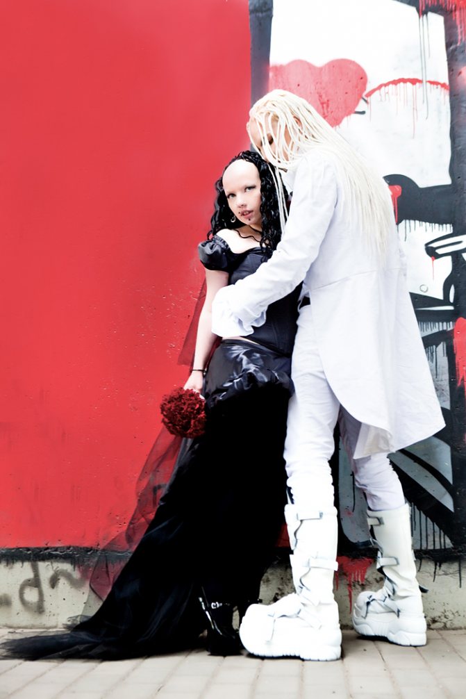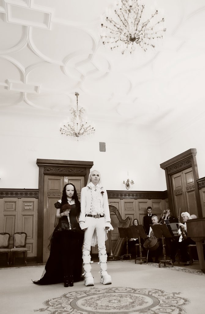 — Туфли для свадьбы я купила в стриптизерском магазине, отходила почти полный день, на след день ноготь на одном большом пальце почернел и вылез. Больше я не смогла их надеть ни разу. Сапоги для жениха были заказаны в интенете, и они не успели дойти, вообще потерялись где-то, нам пришлось экстренно перекрашивать черные, — и все получилось! Костюмы для свадьбы были готовы в ночь свадьбы, то есть спали мы в общей сложности часа 4 перед церемонией. Утром я проснулась с мыслью, «а может не надо»? 12