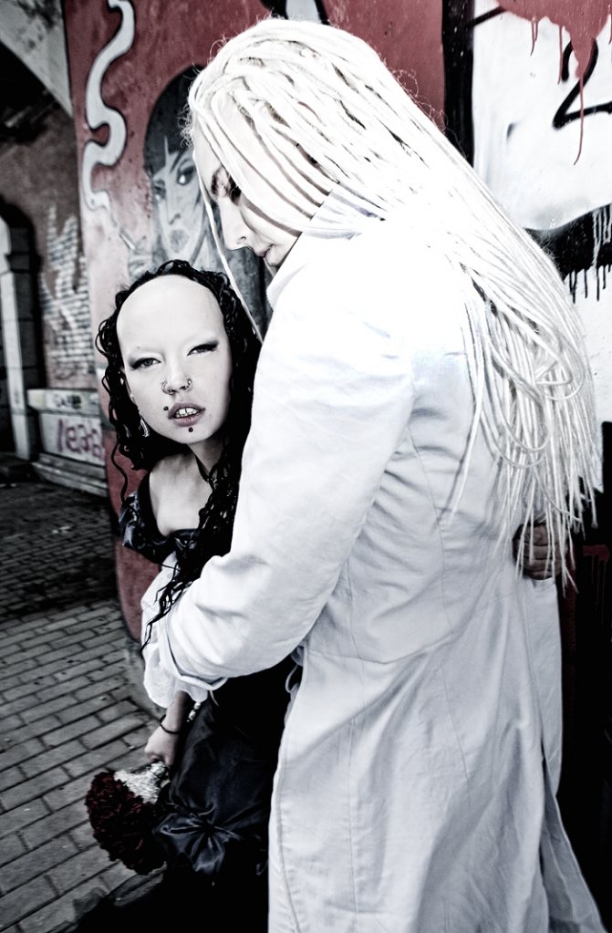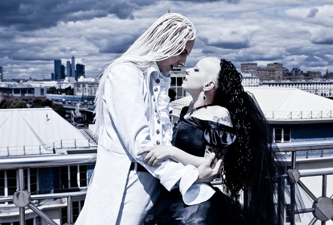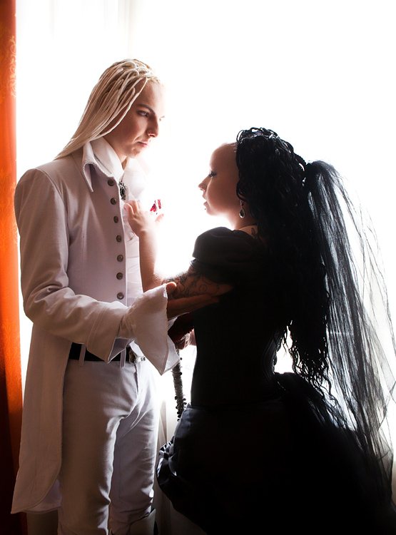Жених. Цилиндр, классический костюм либо фрак, а также макияж в виде пудры и, подведенных черным карандашом глаз, являются основой образа. Неизменные цвета – белый, черный красный. Гостям же можно предложить одеться в темные цвета, либо же взять костюмы напрокат. Когда выбрана готическая свадьба, фото выходят очень необычными.