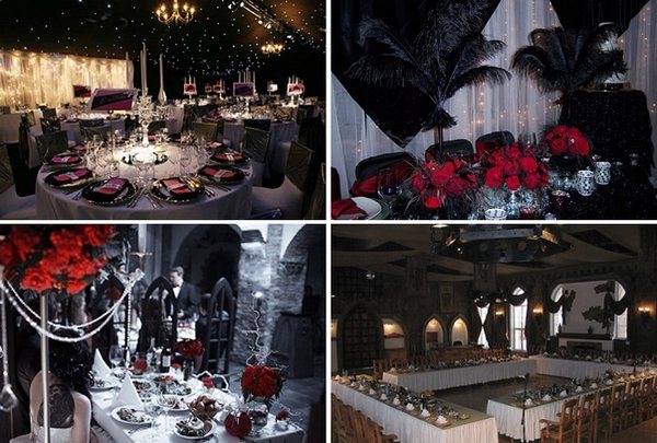 Оформление свадьбы в готическом стиле требует особого подхода. Отсутствие яркого освещения, наличие свечей в канделябрах, темные занавески и скатерти, тяжелые шторы сразу создадут необходимое настроение. Если свадьба будет праздноваться в ресторане, то его стиль должен соответствовать. Мебель, аксессуары и детали должны создавать определенный антураж. Дополнительно пространство поможет украсить: