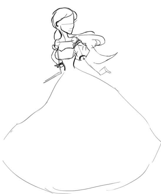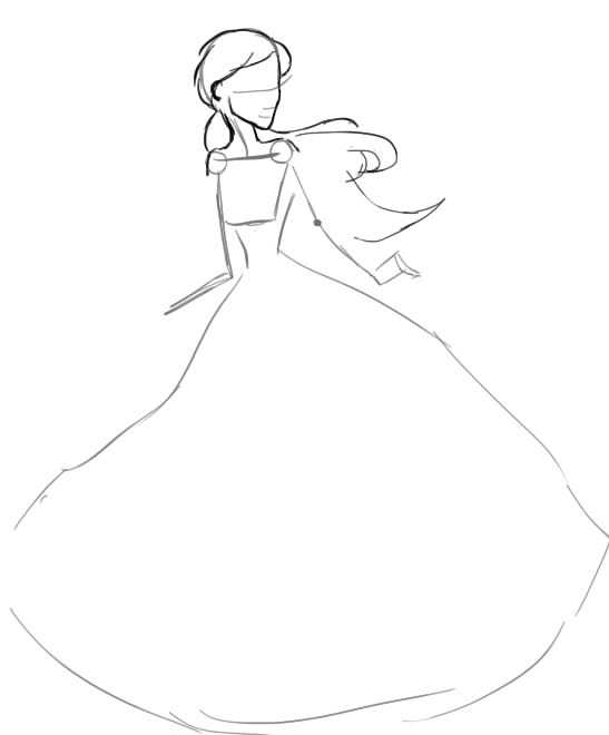Для начала наметим форму платья. Оно будет на одно плечо, так что верхняя часть немного скошена. Нижняя часть платья очень длинная, широкая и пышная.