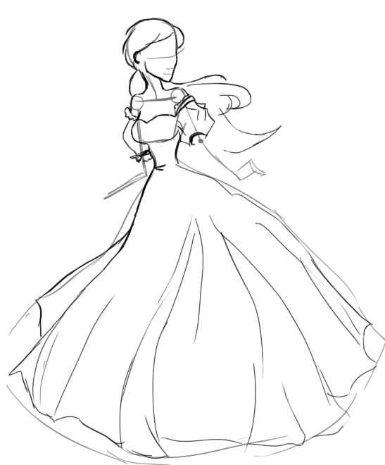 Для начала нам нужно нарисовать основу, на которую мы будем ориентироваться. Основа передаст форму платья, его длину и так далее.