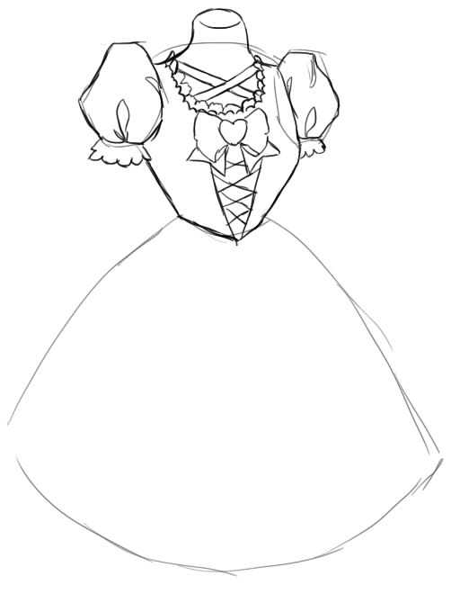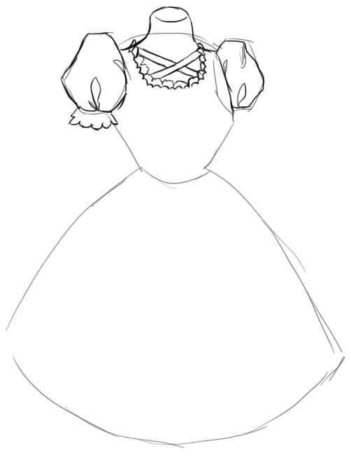 Теперь, когда основа готова, начинаем детализировать форму изображаемого платья. Прорисуем верх, а также добавим пышные рукава.