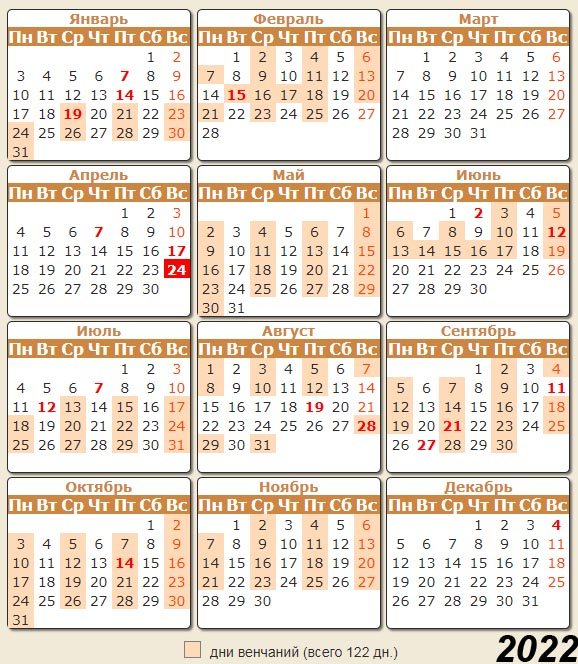 Таким образом, получается, что дней, подходящих для венчания, в течение года не так много. В 2022 году их всего 123.