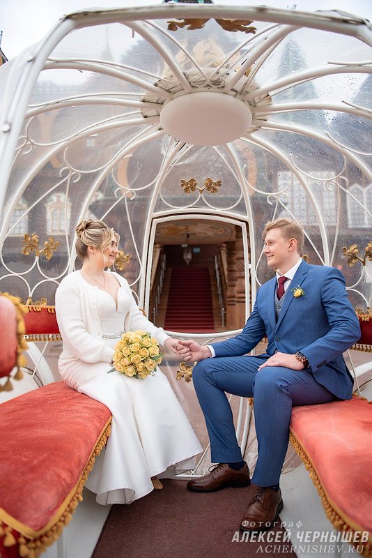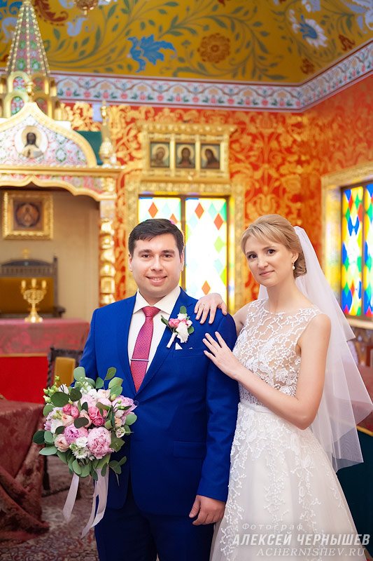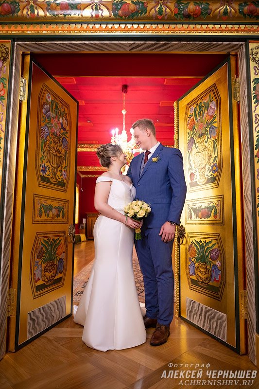 - Фотосессия во дворце Алексея Михайловича после церемонии бракосочетания. Делаем красивую серию постановочных портретных и сюжетных снимков. Проходимся по многочисленным комнаткам оформленным в историческом стиле.