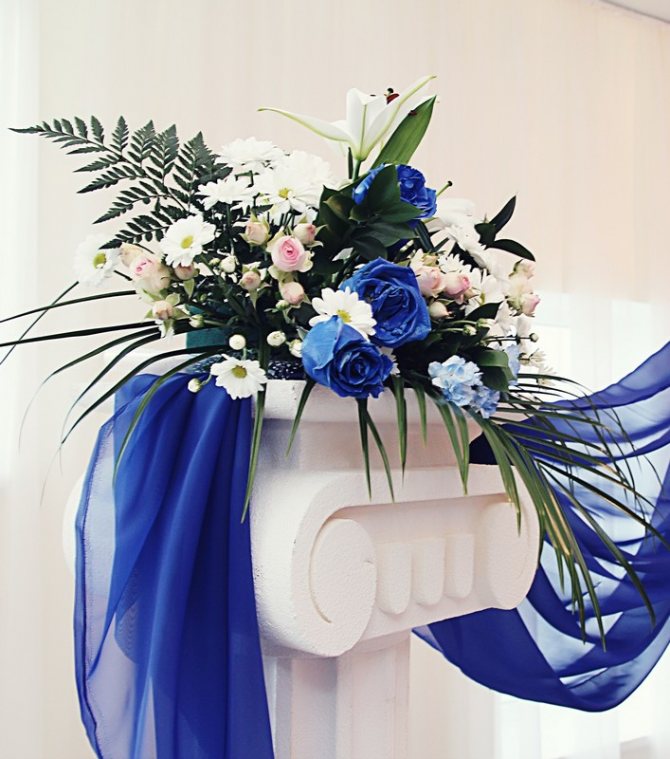 Очень элегантно смотрится цветочная гирлянда, перекликающаяся с букетом невесты из синих роз, ирисов или хризантем. Прекрасно, если вместо зелени бутоны будут утопать в белом или синем кружеве.