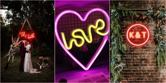 Хотите добавить свадьбе яркости? Тогда используйте неоновые вывески, на которых может быть написана дата Вашей свадьбы, инициалы, хештеги, имена и многое другое, что только позволит фантазия.
