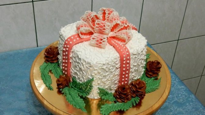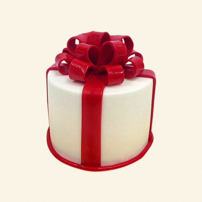Весьма оригинальная идея — торт в виде подарка. Он безусловно заинтересует внимание всех гостей и станет предметом восхищения.