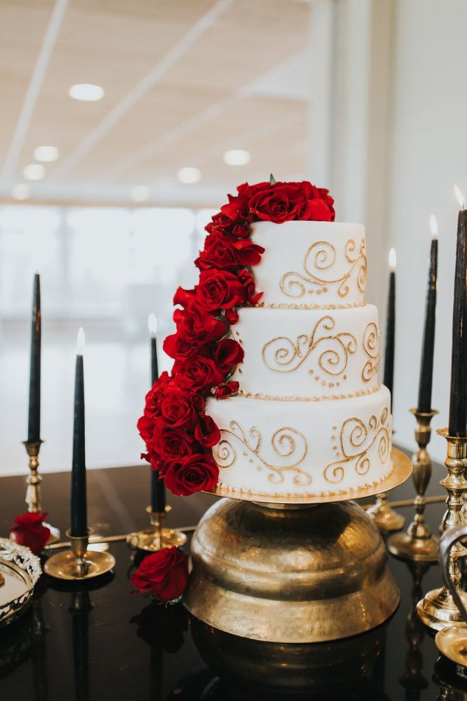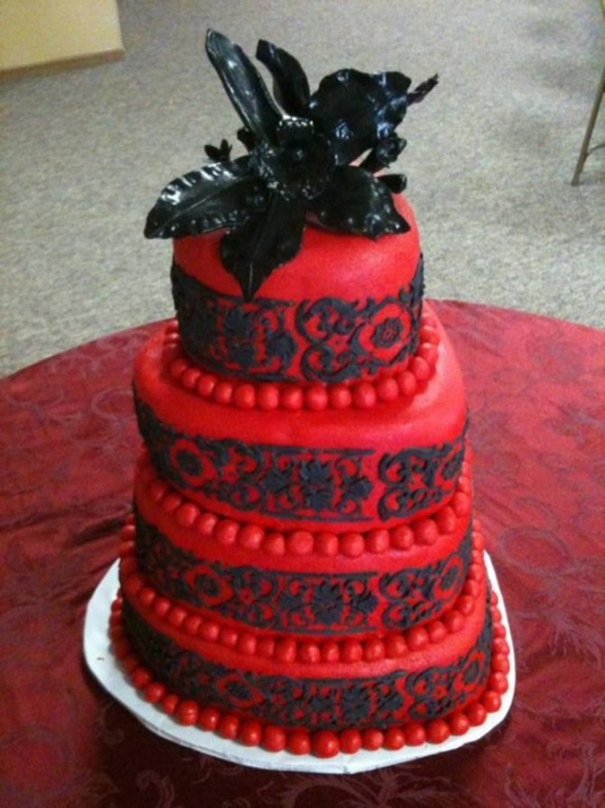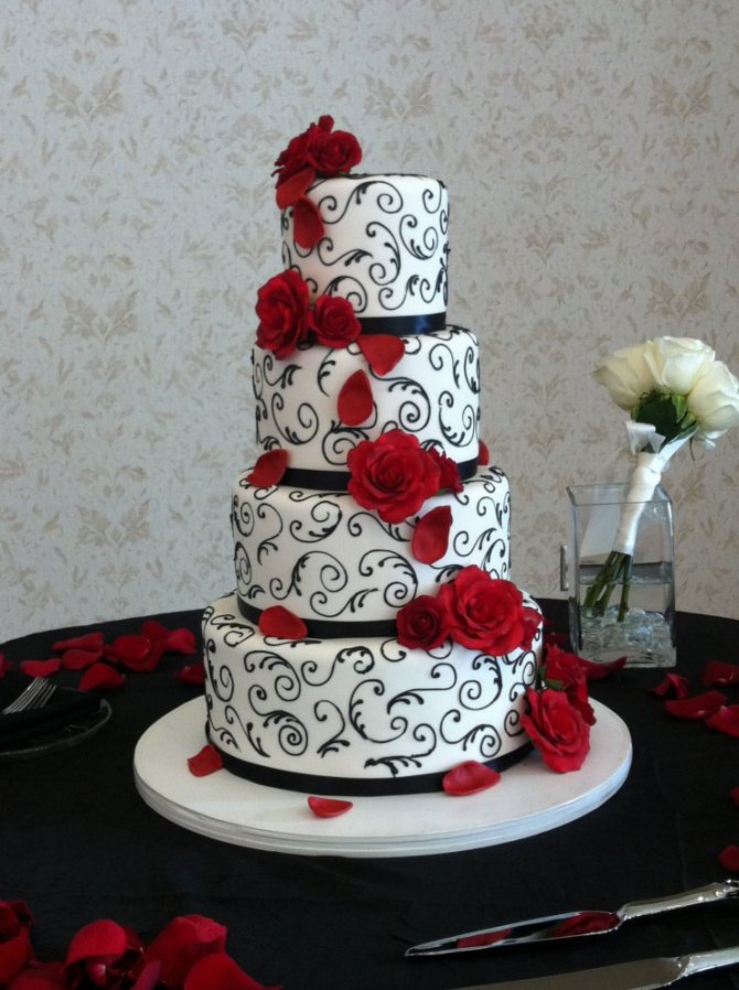 А если в вашей свадьбе преобладают сочетания красного и черного, то отличным решением станет шоколадный торт с каскадом из алых бутонов.