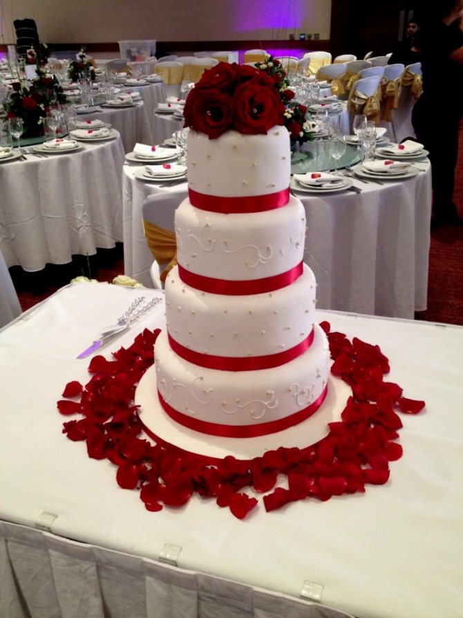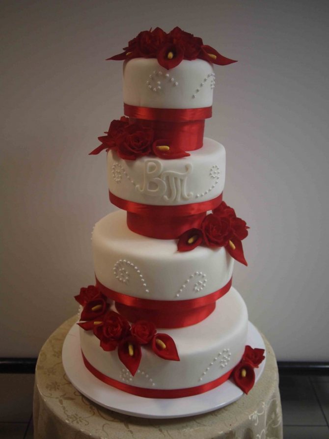 Для оформления можно использовать настоящие ленты, а также сделанные из кондитерской мастики. Очень мило смотрятся бело-красные свадебные тортики, украшенные сердечками, фигурками молодоженов, лебедями и т. п.