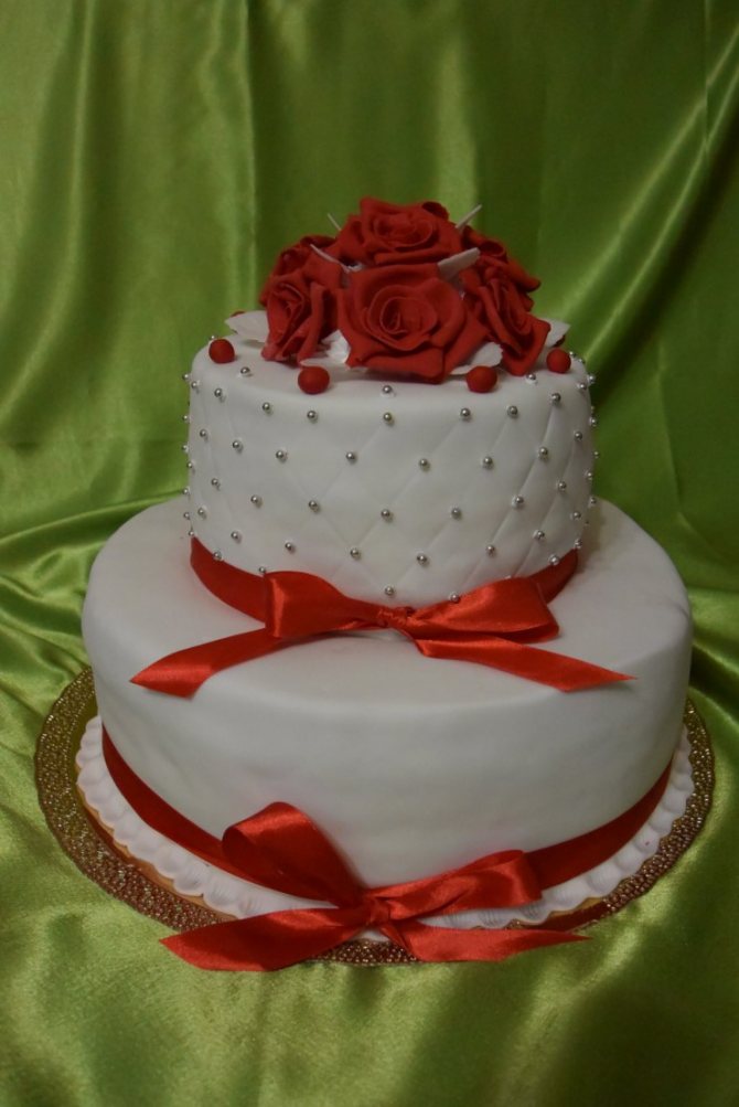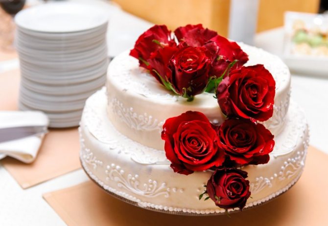 Классический вариант белых свадебных тортов с красными розами не выходит из моды. Роза является символом любви и страсти, поэтому ее традиционно применяют для оформления свадебных торжеств. Эффектные красные бутоны располагают в некоторых местах ярусов торта и на верху. Верх может декорироваться композицией из нескольких бутонов. Обычно для этого используют цветы из мастики.