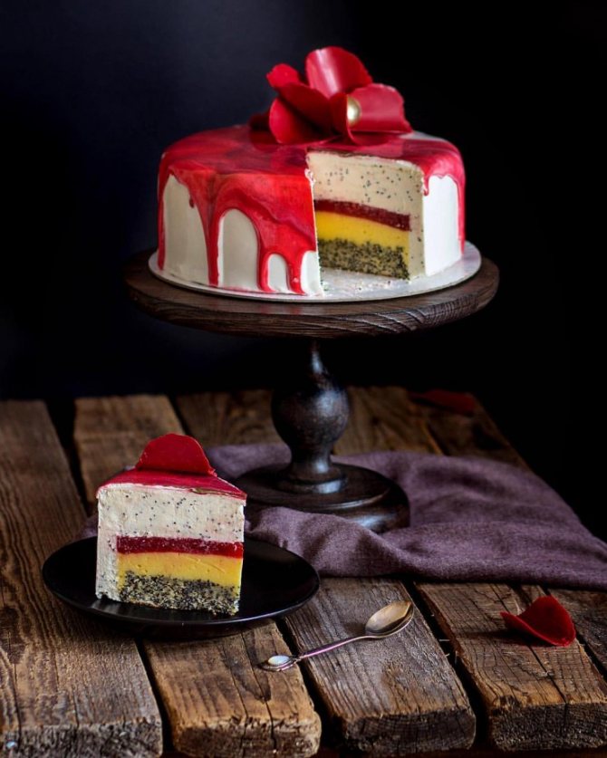 При создании алого торта используются пищевые красители, которые придают оттенок крему, мастике и другим пищевым материалам, из которых состоит угощение.