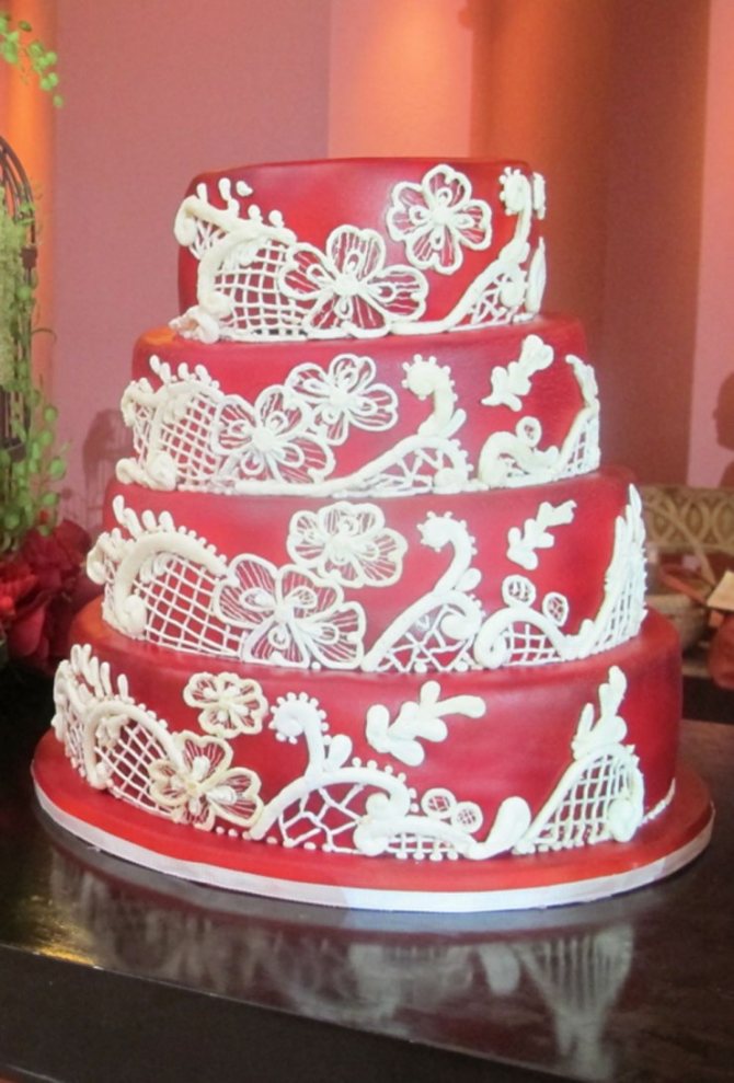 Декорирование тортов на свадьбу кружевами стало новой модной тенденцией. Белый ажурный узор на красной мастике – невероятно красивое зрелище. Элегантно и нарядно выглядит и обратный вариант – кружево красных тонов, обернутое вокруг белоснежных ярусов торта.