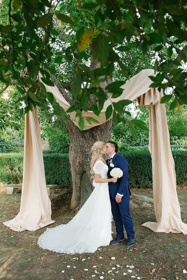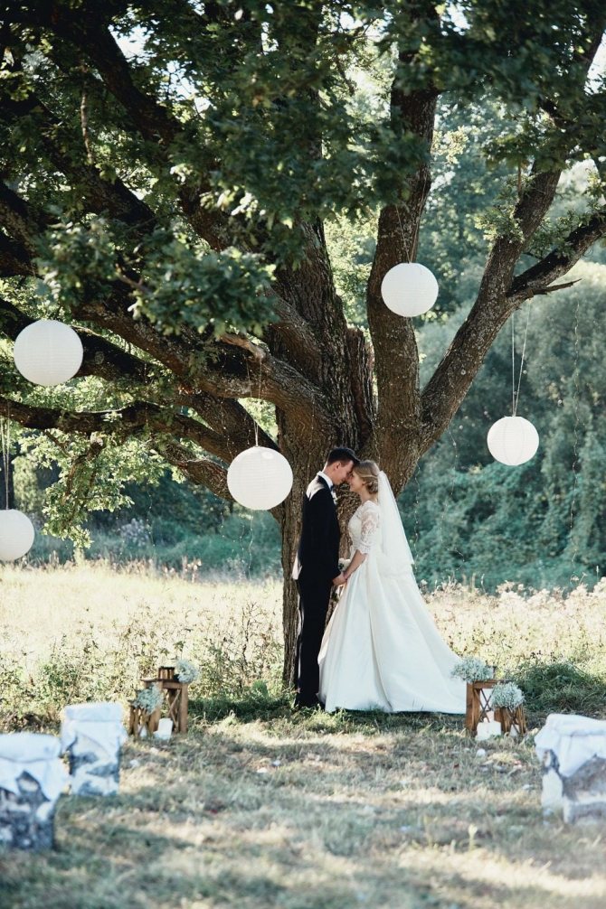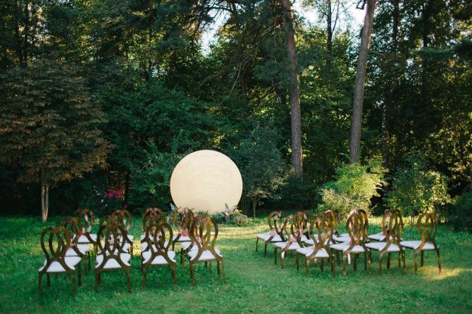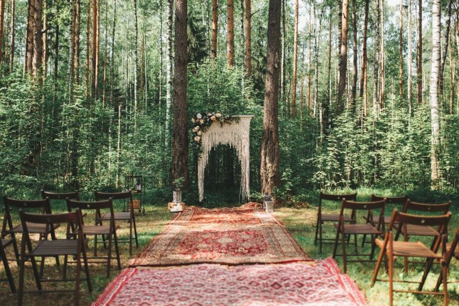 Если ты не любишь сложные и вычурные формы и стремишься сделать свое торжество максимально естественным и простым, обрати внимание этот тренд: даже обычный плющ на арке будет смотреться превосходно. Лоза, простая рамка, роскошное дерево, украшенное легкой тканью, – все это может стать отличным фоном для церемонии.