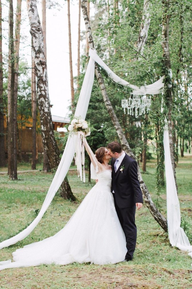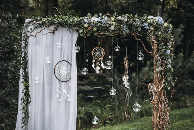 Легкие конструкции (витые узоры, шелковые ленты, бусины и подвески) добавят еще больше воздуха в задумку. Такие арки сейчас приобретают все большую популярность, так как выглядят как будто созданными самой природой. Подойдут они для небольшой свадьбы, не перегруженной декором и деталями.